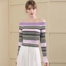 .Images of Striped print patchwork off shoulder slash neck elastic knit pullovers sweater shirts 2018 new women autumn short sweater